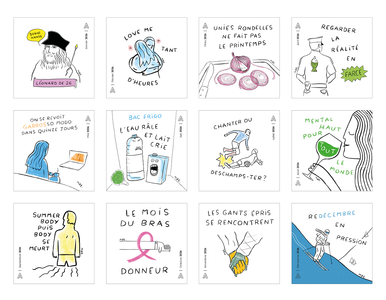 Pour la nouvelle édition de son calendrier, Adden s’associe à Mat « illustrateur » et créateur du compte Dessinance cognitive où il met en dessins des détournements phonétiques.